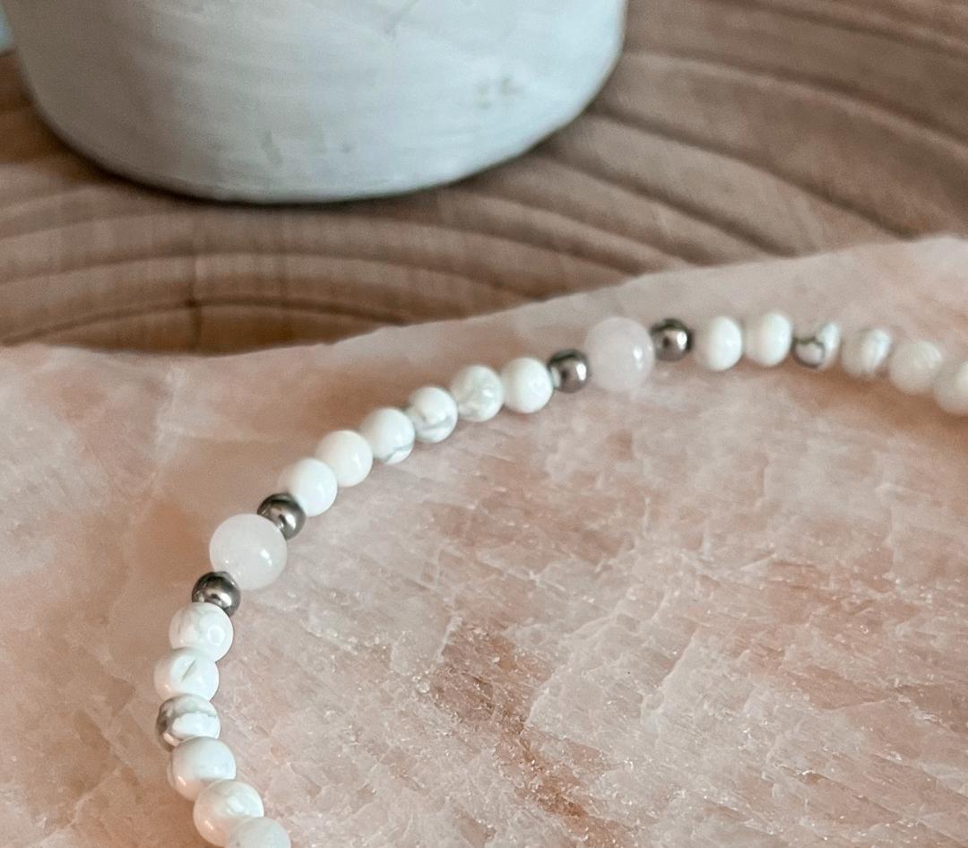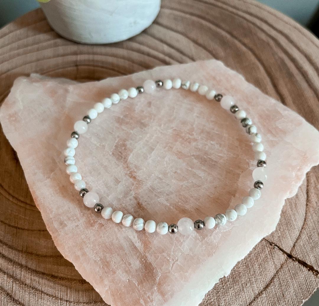 This Anklet was created using 4mm Howlite and 6mm Rose Quartz finished with Stainless Steel/Nickel Free spacers.