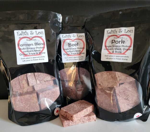 The latest additon to our Edith & Lou line of all natural products is our FREEZE DRIED DOG FOOD! Available in 3 delicious flavours – BEEF, PORK and FARMER’S BLEND containing both!