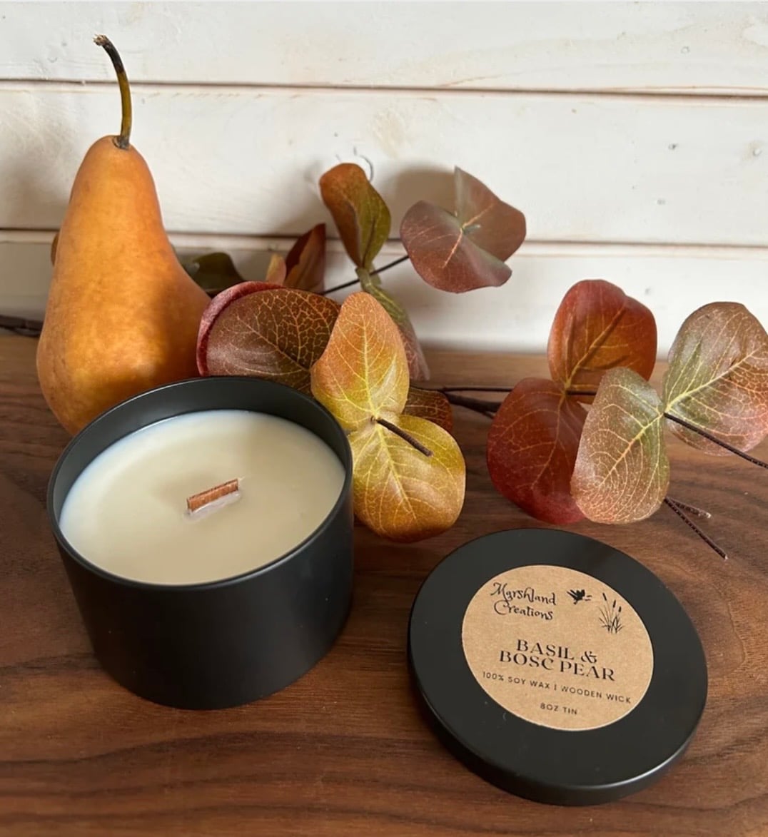 Our candles are 100% soy wax with a crackling wood wick. They are available in a variety of scents in 8oz black tins.
