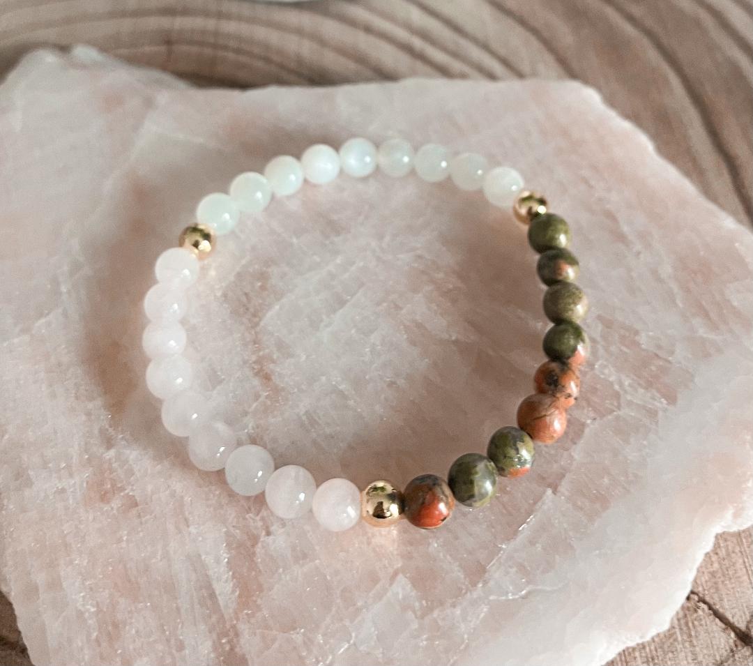This Bracelet was created with 6mm Unakite, Rose Quartz and White Moonstone. Finished with 14K Gold plated spacers.