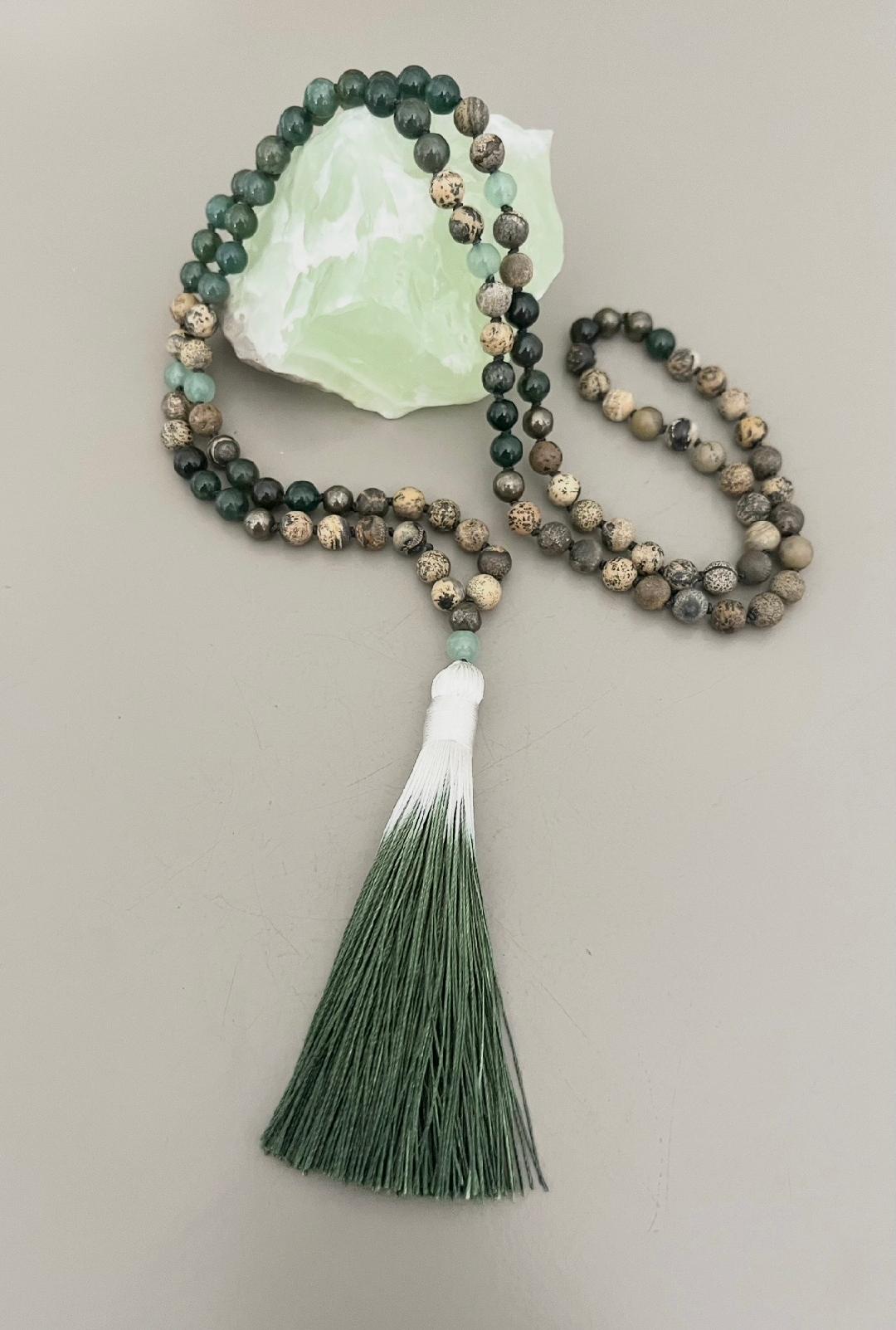This beautiful Mala is a one of a kind ! Designed and hand knotted with a beauty ombre tassel. This necklace is created with 108 gemstone beads.