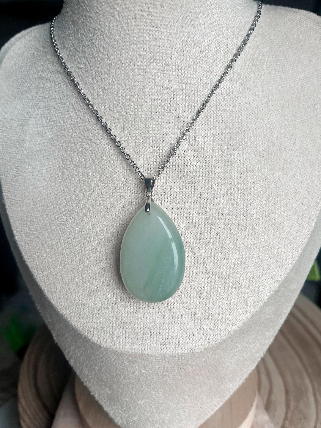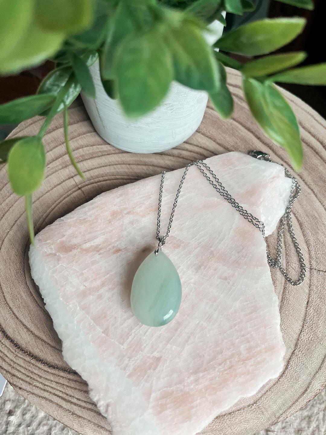 This juicy Mint Jade teardrop pendant comes on a Stainless Steel/Nickel Free chain.