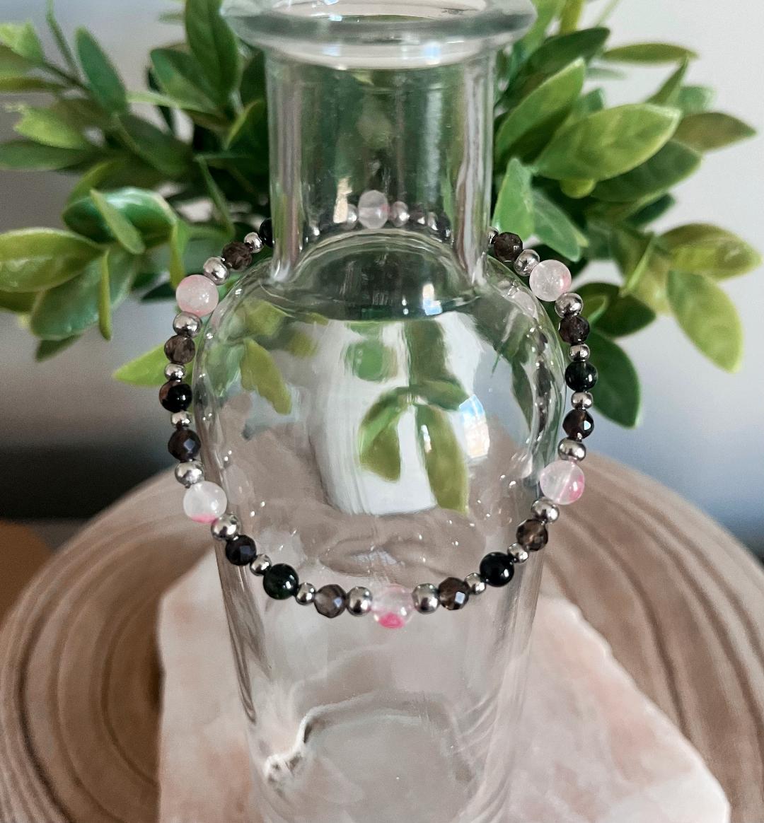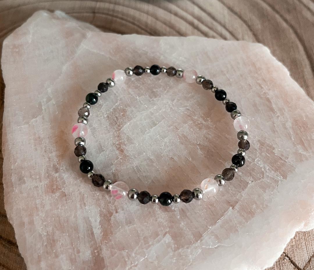This Bracelet was created with 4mm Smoky Quartz, 5mm Rhodonite in Quartz and finished with Stainless Steel/ Nickel Free spacers.