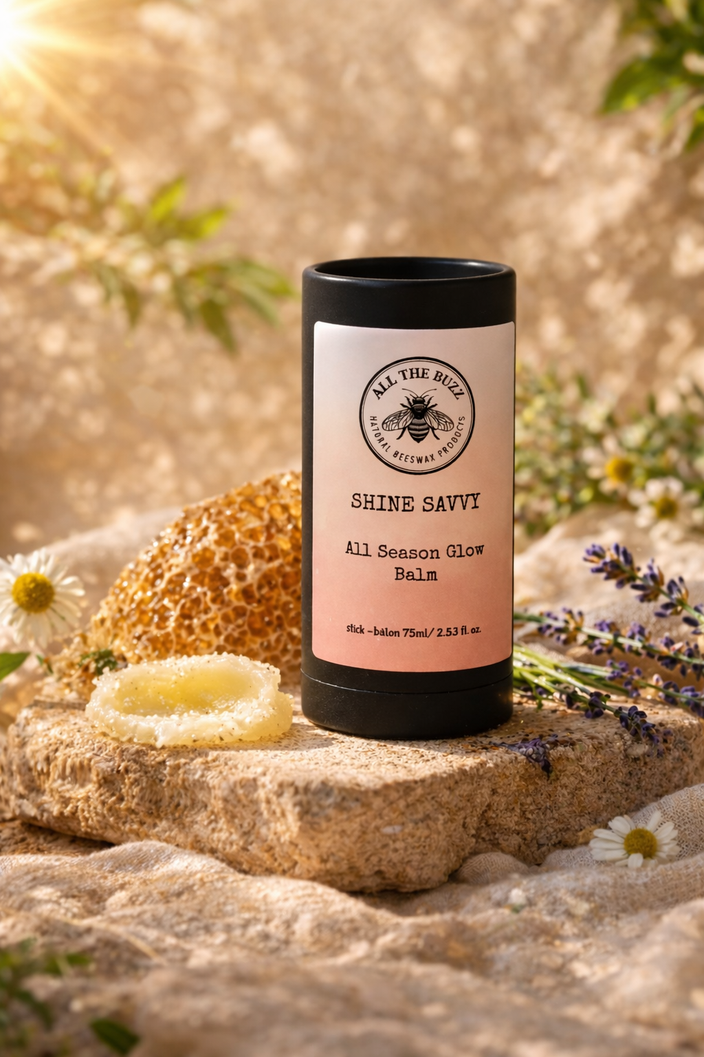 Elevate your everyday glow with our Shine Savvy Glow Stick—a luxuriously smooth, all-natural balm made with locally sourced beeswax, virgin coconut oil, mango butter, non nano zinc oxide, red raspberry seed oil and carrot seed oil. Designed to enhance your skin with a soft, sun-kissed luminosity. Handcrafted in small batches, this elegant glow stick melts effortlessly into the skin, delivering a sheer, dewy finish that feels as beautiful as it looks.