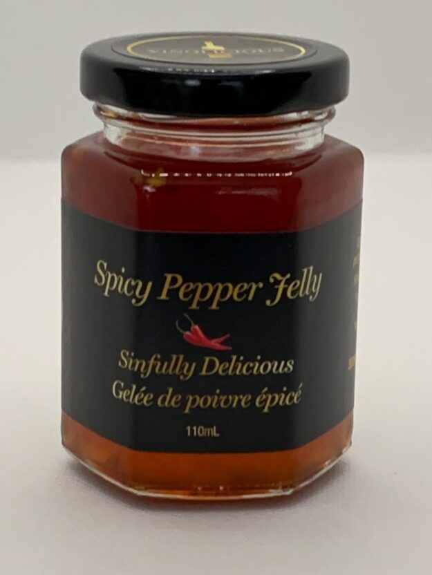 Spicy Pepper Jelly – prepared with 3 peppers, sugar, vinegar, pectin. Contains no dairy, gluten, peanut or tree nut. Sinfully Delicious.