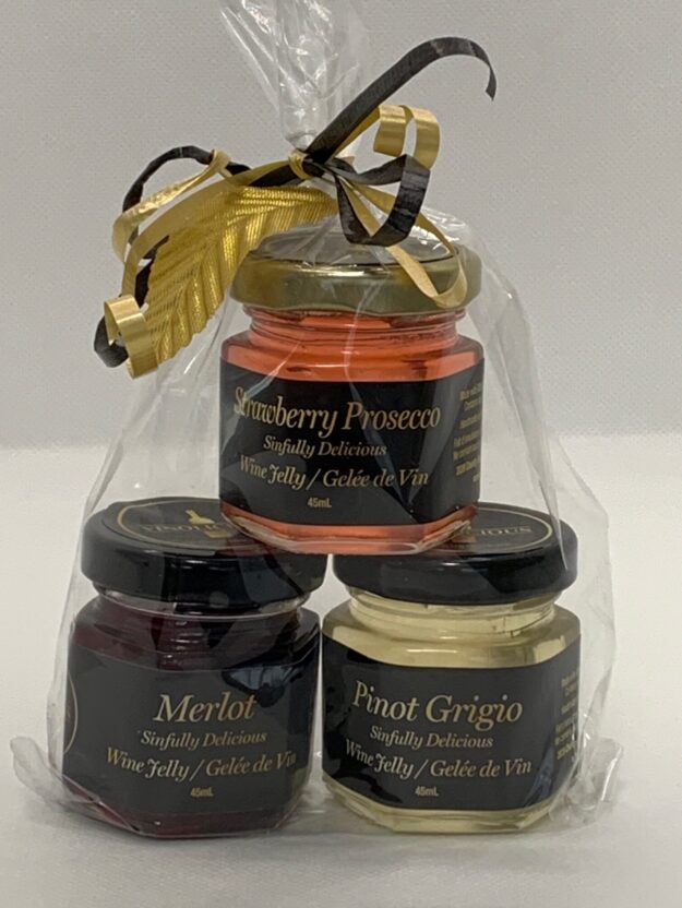 Merlot, Pinot Grigio and Strawberry Prosecco Gift Pack – prepared with wine, sugar, pectin, natural flavour. Contains no dairy, gluten, peanut or tree nut. Sinfully Delicious.